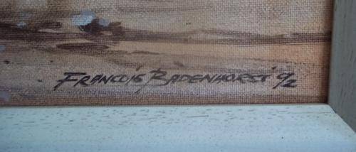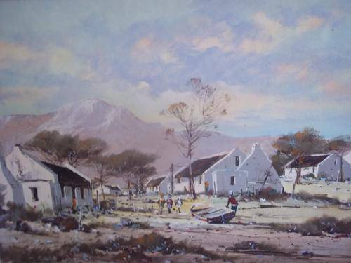 Francois Badenhorst (1934 - ) , Oil on Canvas, 45 x 60 cms. "Fisherman Cottages", signed and dated 1992. Pristine Condition. A very detailed work by this SA Master. Framed in solid frame with white wood inlay. ........ Couriered by Berco Couriers to the winning bidder courtesy of Sekoto Oil. If the winning bidder is on holiday, this work can be kept at Sekoto Oil headquarters until the winning bidder returns home. Sekoto Oil's auction are subject to early closure !