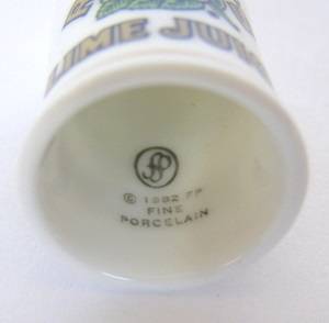 An advertising thimble for Rose's Lime Juice produced in 1982 by Franklin Porcelain in USA. They produced various thimbles depicting products in the United States from bygone days. This thimble has the same logo at the front and back, and is also trimmed with two gold bands.