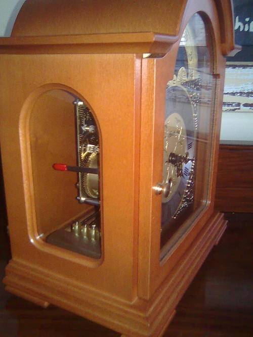 This clock is brand new but out of the box. Chiming mantel clock. Shouldered arch style mahogany finish wood case with pyramid mahogany veneer. Side glasses, hinged front door, etched moving moon phase dial, and cast brass corner spandrels. Perfect pitch tune. for more info Google Franz Hermle Debden.