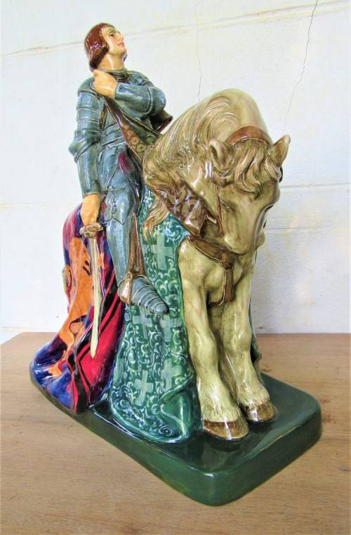 Not often seen these days, unusually large Royal Doulton Figurine depicting St George on horse back. Introduced from 1950, figure is a limited edition (not sure of how many were produced). executed in strong polychrome decoration. In perfect condition this figure is worth well over R30000. sadly this example sustained some damage many years ago. There is some damage to the rear of the figure and can be professionally restored if desired. However item displays well as is. Base is intact, thus maintaining strength. As a rare and large item, a Royal Doulton Collector might well wish to acquire such an imposing piece to have it restored to it's former glory at a very low price, less than 5% of full value. (BEAR IN MIND COURIER DELIVERY IS FREE AND SECURE PACKING ENSURES SAFE DELIVERY 1 to 3 days dependent upon location.)