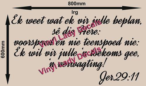 FREE SHIP/LOW COURIER - BYBEL VERS JEREMIA 29:11 AFRIKAANSE KWOTASIE 1 - WALL STICKER - 60+ COLOURS