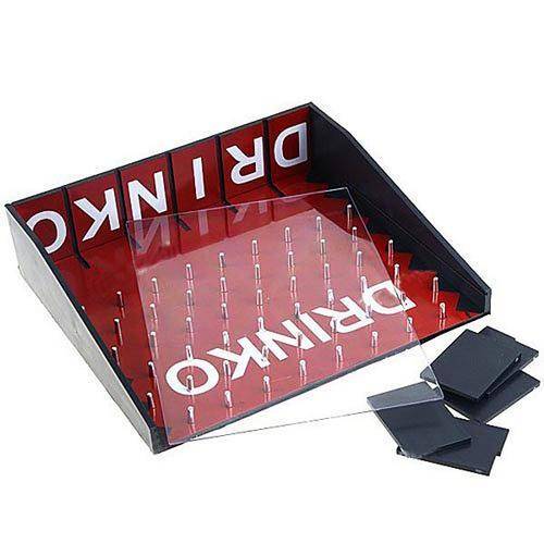3. Players take turns dropping their chips anywhere along the top opening of the Drinko game board.