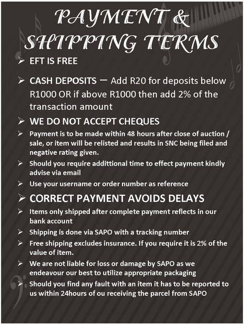 R65.00 Standard shipping applies to orders under R100.00, in most areas in South Africa. R35.00 Standard shipping applies to orders over R100.00. Some areas may attract a surcharge surcharge. This will be calculated at checkout if applicable.