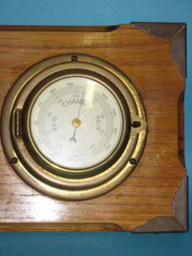 French Barometer in Oak and Brass, Fully Operational and Working. About 48 x 17 cm. Inside the base of the clock "porthole type casing" is some stains/marks.