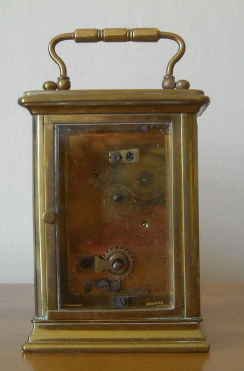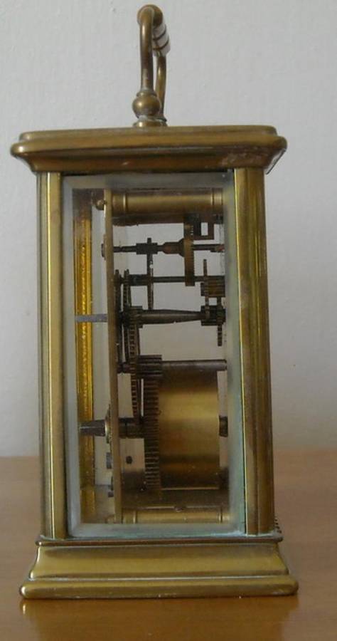 This beautiful brass clock dates from the late 1800's and has the original case. Engraved "FRANCE" on the back of the clock, the little door has the number "45" engraved on the frame in very old writing. The glass is bevelled on all four sides, unfortunately the face glass has been chipped on the top right and the bottom left. The original case is lined with blue velvet, and it has the original clock key which is a seperate compartment. The side of the case lifts up to allow the clock to be seen through a piece of glass - a real carriage clock!! White enamel with Roman dial, the clock measures 7cm x 11cm, (excluding handle) it is not in working condition. A very collectible vintage French carriage clock with the original case. Postage R35