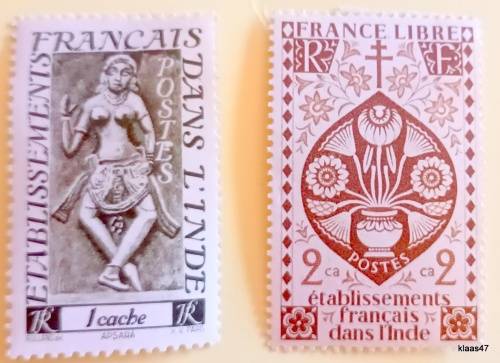 French India - 1948 Bas-relief Figures Apsaras and 1942 Lotus flowers - 2 Unused Hinged stamps