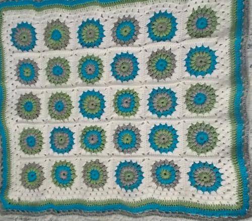 Made with acrylic wool in a tapestry of bright and fresh flowers in turquoise, grey and green