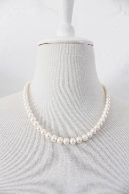 Beautiful modern round freshwater pearl necklace with silver tone screw clasp. Not knotted between beads.