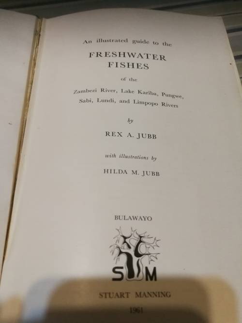 AN ILLUSTRATED GUIDE TO THE FRESHWATER FISHES OF THE ZAMBEZI RIVER , LAKE KARIBA , PUNGWE , LUNDI AND LIMPOPO RIVERS REX A JUBB ; Hardcover with dust jacket ; published by STUART MANNING 1961 ; Bulawayo ;Rhodesia ; Zimbabwe ; Illustrations by HILDA M JUBB ; No. of Pages ; 171 .