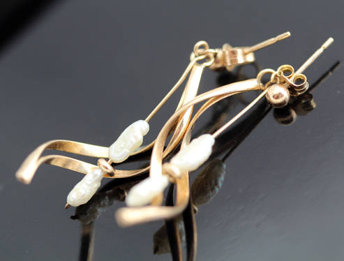 These earrings are just so pretty and so unusual! The clever design of spiral ribbons suspended with a straight hanging shank on which two pearls are threaded guarantees wonderful movement; the weight of the freshwater pearls hold the shank vertical, while the spiral ribbons dance and twist about their upright neighbour! These are a lovely, classic combination of shiny polished yellow gold with the soft glow of pearls in a contemporary design. Expertly crafted, and in good condition, the chandelier is 37mm long and 9mm wide, suspended from a simple gold stud. The 9K hallmark indicating 9 carat gold appears. Truly gorgeous, dressy, special-occasion earrings that are big enough to be a conversation piece (37 mm long guarantees they'll be noticed!) but without any bling, are elegant and understated. Handmade piece from a favourite vintage London shop!