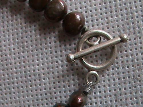 FRESHWATER PEARL BRACELET. 19.5 CM LONG. GOOD GRADE CHOCOLATE COLOUR PEARLS. METAL TOGGLE CLASP.