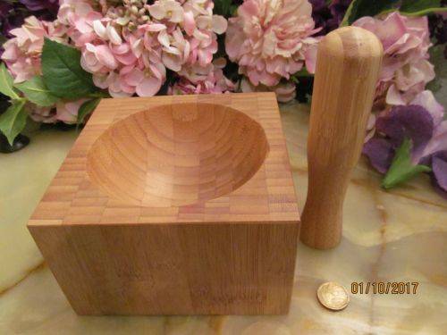 A CUBE SHAPED MORTAR WITH A CIRCULAR HOLLOW BOWL AND AN. OCCASIONAL STAND WHICH CAN BE USED FOR ANY OTHER OBJECT OR DISPLAYED WITH THE MORTAR AND PESTLE. THE CHECKERED DESIGN OF THE WOOD ADDS A FRESH FEEL TO THE ITEMS WHICH ARE HAND MADE FROM A NATURAL LIGHT WOOD. THESE ITEMS ARE SUPER TOUGH AND DURABLE HIGH QUALITY PRODUCTS