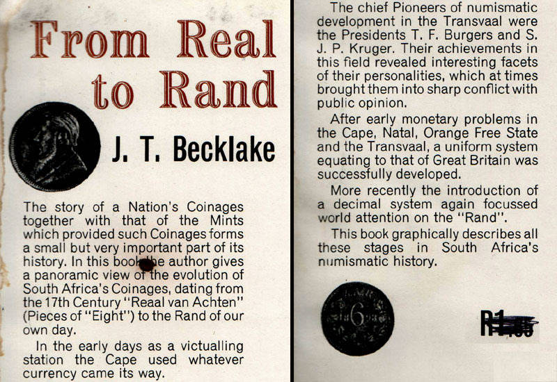 From Real to Rand, The Story of Money, Medals and Mints in South Africa, by J.T. Becklake, Central News Agency Limited, circa early 1960s. Becklake was the last Deputy Master of the Mint, Pretoria, and first Director of the South African Mint.