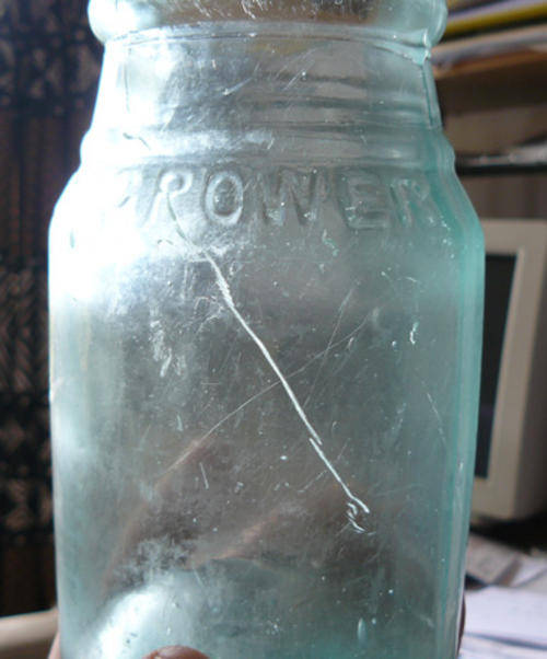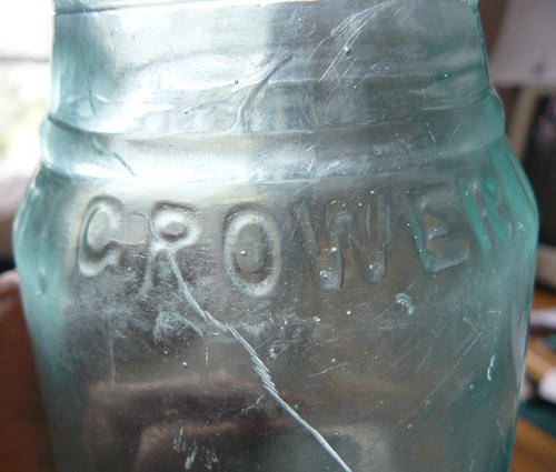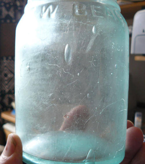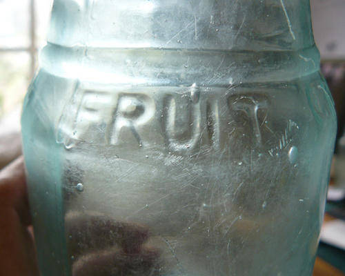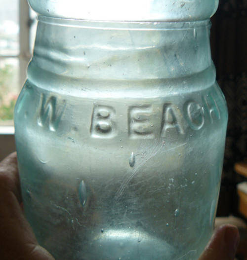 A nice wide mouthed aqua jar, embossed T. W. Beach Fruit Grower. The jar stands 15.5cm high and the mouth internal is 6cm diameter. There are some nice air bubbles and a fold or two in the glass. There is one surface scratch running below "Grower".