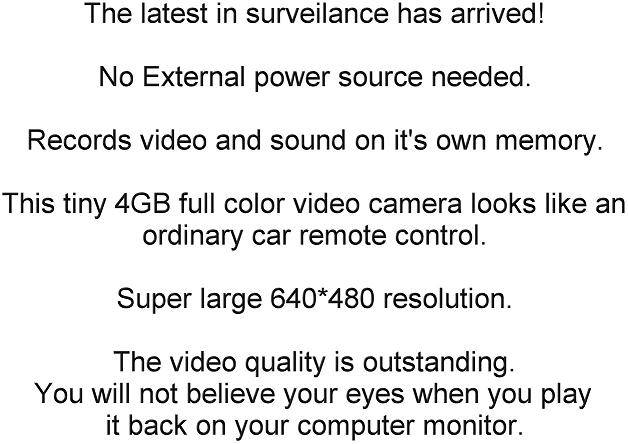 1 x Spy video car remote control, 1 x 4GB micro SD card, 1 x USB cable for downloading and charging to and from your computer.