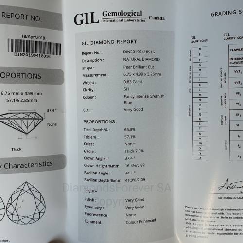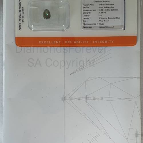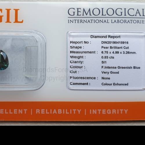 | Diamond Colour : | Fancy Intense Greenish Blue - Enhanced (Heat only) |