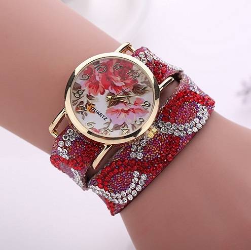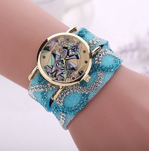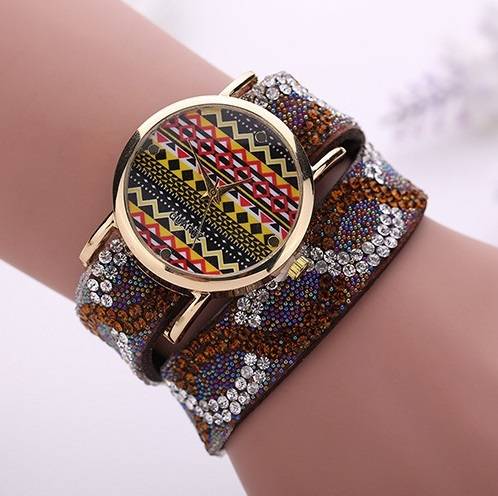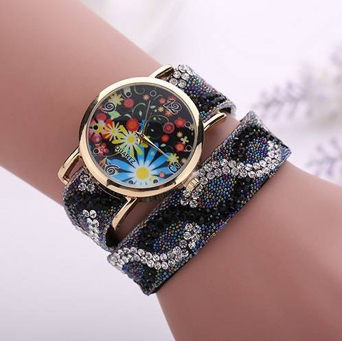 Wrap around faux leather and rhinestone Wrist Watch. band length 39cm, watch face diameter 3.5cm. Watch closes with press studs