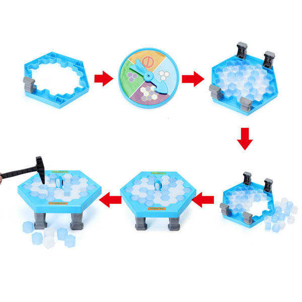 Package Includes: 1x Ice breaking table 38x Blue and white ice blocks 4x Stents 2x Hammers 1x Penguin 1x Spinner
