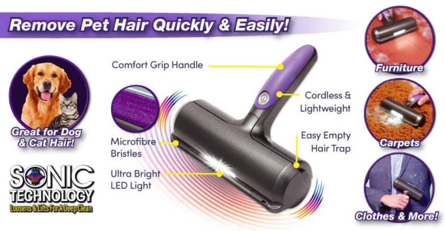 Safely remove pet hair from your furniture or clothes with the Fur Daddy Sonic Pet Hair Remover. Its sonic technology picks up and removes unwanted pet fur from surfaces while a built-in LED light helps you see hair in dark dimly lit spaces
