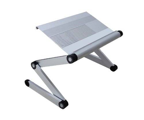 The FURINNO A6 ultralight adjustable laptop table features an air-vented design that reduces overheating of your laptop; notebook; or tablet. Features Can be set in multiple angles to fit any body position; even laid back on your bed; just hold the button on the joints; change the position; and release the button to lock it in place Grooved table surface to prevent slippage; and wrist guard added for extra comfort Weighs 5 pounds and can support up to 30 pounds; height is adjustable from 11.25 inches to a full height of 22 inches 100% aluminum alloy composition provides sturdiness and a stylish look; available in black; purple; silver; and pink Collapsible frame for easy storage and portability Suitable for laptops up to 17 inches No assembly required; product dimensions: 22(W)x11.4(D)x1.38(H) inches