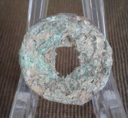 Two Wu Shu coins that have become fused together with time, covered in a lovely green patina. Coins were not minted with dates, but this form was used between 118 BC to 220 AD.