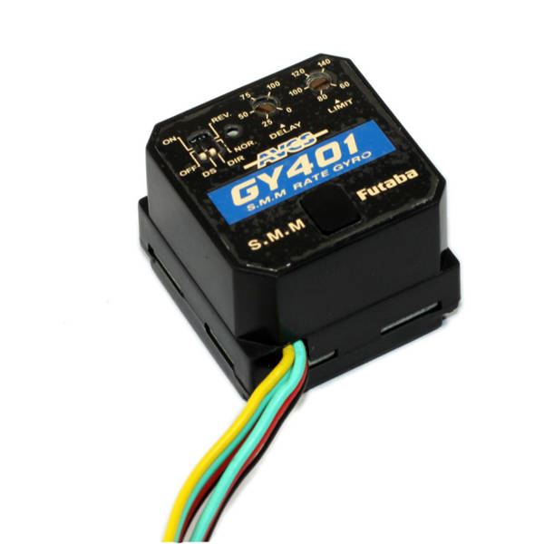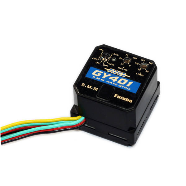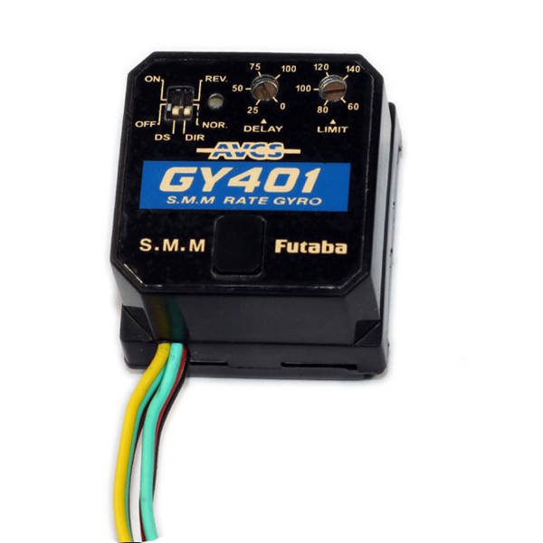 Futaba GY401 Head Locked Gyro for 400 450 RC Helicopter After several years, the Futaba GY401 Gyro remains to be the bench mark gyro that all others are judged. Ask 5 RC helicopter enthusiasts what the best Gyro is and 4 of them will likely say the GY401. It is said that copying someone or something is the highest form of flattery; guess that is why there is a cheap GY-401 clone hitting the market almost every month it seems. Unfortunately while many try – none provide the performance or piece of mind Futaba’s GY series of gyros offer. The Futaba GY401 gyro is for the heli pilot who wants both flexibility in terms of what model heli the gryo works well with and wants the assurance that a gyro malfunction or failure won’t bring down his/her dream machine. The GY-401 works well in almost every single rotor bird out there from 400 size electrics up to 52cc gas or MW54 powered turbine monsters with rotor diameters approaching 2 meters. In fact, Bergen RC recommends the the GY 401 in their industrial Observer line of heavy lift gas and turbine RC helicopters. The large range of heli size usage and outstanding performance is why the GY-401 outsells every other performance gyro on the market right now - It works in almost anything! In fact, when I asked my local (ok, 500 km away) hobby shop how many Futaba GY-401’s they sell – the numbers were remarkable. More 401’s than all the other gyros combined – pretty impressive! I know many people who started with a Futaba GY401 gyro in a small 400 size electric knowing one day they wanted to get into a larger electric or nitro powered heli. The GY-401 follows the progress and that alone offers some nice value if you don’t want to have to purchase another gyro for your next bird. Description: Type: Micro Heading Hold Gyro Sensor: SSM AVCS Weight: 27g Dimensions (WxLxH): 27 x 27 x 20mm Gain Setting: Remote Only Mode Setting: Rate or Heading Hold – Remote Only Operating Voltage: 4.8 VDC (Needs a voltage regulator (6 VDC) if using higher than 4.8v battery packs) Reversing Switch: Yes, on gyro Limit Trimmer: Yes, adjustment on gyro Function: with reverse switch, DS mode switch, control delay adjustment knob, servo stroke volume adjustment knob. By transmitter to adjust gyro sensitivity and switching lock (AVCS) mode and normal mode. Futaba GY401 Features: AVCS (Angular Vector Control System) is Futaba’s patented heading hold gyro technology. AVCS works better than other HH gyro systems at correctly compensating for and eliminating drifting issues in heading lock/hold mode caused by temperature changes within the gyro. The GY-401, just like all of Futaba’s AVCS gyros uses a SMM gyro sensor and is said to be better than other conventional solid state yaw sensing technologies since all the electronic components are combined on a single chip improving performance and reliability. SMM stands for Silicone Micro Machine. Both Gain and Heading Lock/Rate modes are remotely adjustable through the gyro settings menu on a computerized radio. If you don’t have a programmable computerized radio that you can program in different ATV values for the gain settings, the Futaba GY401 will not work for you – there are no gain or mode selection options on the gyro case. A better choice for non computerized radios or if you are lacking a spare channel for remote gain would be the Futaba GY240 or the E-flite G90 (for smaller helis). The Futaba GY401 has a built in Limit Trimmer adjustment so you can set the amount of tail rotor servo travel to avoid servo over travel and stress on the servo. This is an easy way to set the travel over the more conventional method of changing servo arm/tail rotor pitch arm lengths. As mentioned, the GY401 supports both slower analog tail rotor servo pulse rates or can be switched to a 270 Hz high frequency rate for fast tail rotor specific digital servos. Speaking of servos, the 401 comes in two different packages. You can purchase the Futaba GY401 Gyro only package or the Gyro/Servo combo package. How To Setup The Futaba GY401 Gyro? The GY401 gyro by Futaba is perhaps the most popular RC helicopter gyro ever. It’s simple to use, works with a wide variety of analog and digital servos and has a very attractive price point. GY401 Pre-Setup Setup Plug the gyro’s main lead (black with 3 wires – black, red, green) into the rudder channel on your receiver. This is channel 4 on most receivers, but consult your radio’s manual if you’re not sure. Then plug the other lead (red servo plug – yellow wire) into the gain channel in your receiver. This is normally channel 5, but can be also be set to any aux channel. Again, if you’re not sure, check your manual. Since there is only one wire on this channel, you need to make sure you plug it in correctly. The yellow wire should line up with the other lighter colored wires in the receiver. Depending on the servos and other electronics you’re using, these could be white, orange or yellow. And finally, plug the other servo lead (black female lead) into your rudder servo, GY401 Warning: If you have DS (digital servo) mode enabled and you’re using an analog servo, there’s a good change you’re going to burn out the servo motor. If you’ve got analog mode selected for a digital servo, you’ll want to get it switched around, but it’s not likely to cause any immediate problems. Check the switch on the gyro and make sure it matches the tail servo you’ll be using. You’ll also need to mount your gyro to your helicopter using the foam mounting pads that come with it in a place where it will be secure and stay relatively safe in a cr