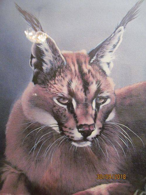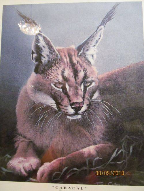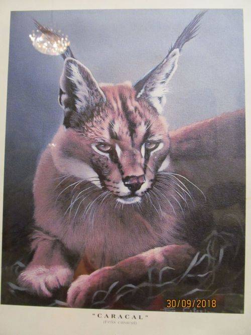 THIS ITEM IS AN ARTISTS PROOF WHICH DEPICTS A WILDLIFE CARACAL (FELIS CARACAL) PORTRAIT IN REALISTIC COLORS PORTRAYED IN A RECLINING POSITION WITH THE CHARACTERISTIC TUFTED EARS. THE CARACAL IS A MEDIUM-SIZED WILD CAT NATIVE TO AFRICA, THE MIDDLE EAST, CENTRAL ASIA AND INDIA. THREE SUBSPECIES ARE RECOGNIZED