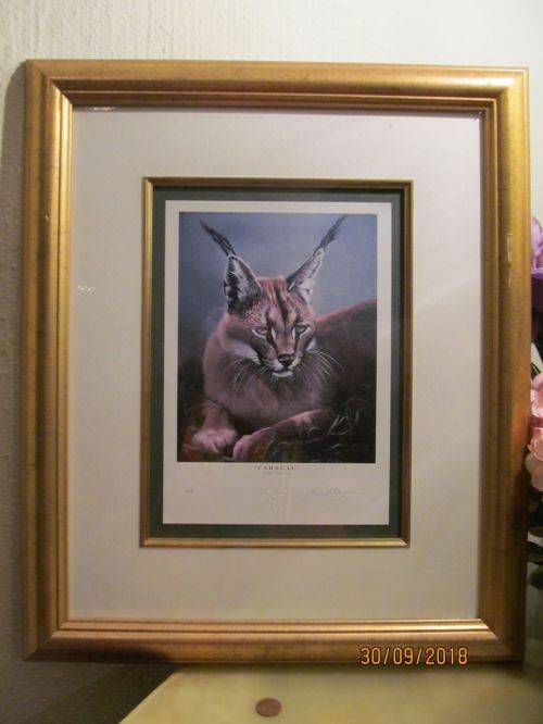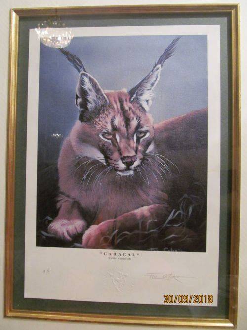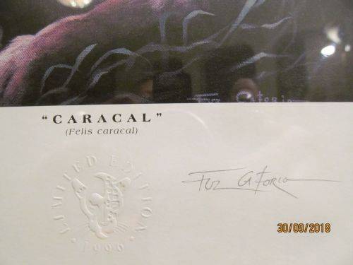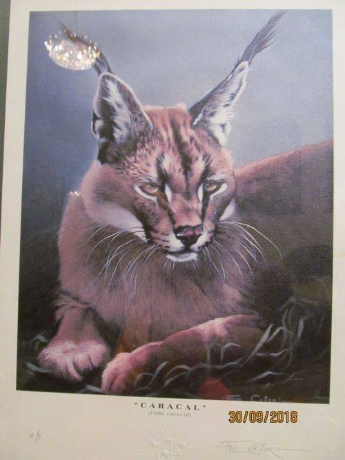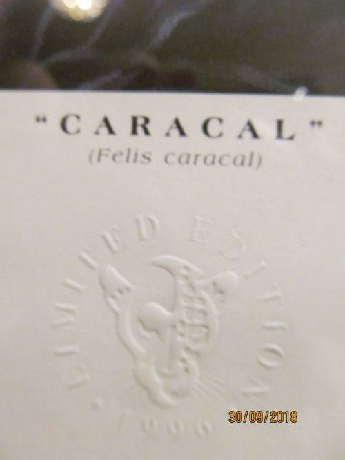 STAMPS/MARKS ETC : IN PENCIL BOTTOM LEFT - "A/P" AND SIGNED BY THE ARTIST IN PENCIL BOTTOM RIGHT. AT THE CENTER BOTTOM IS A PRINT TITLE - "CARACAL (FELIS CARACAL)" BENEATH THIS IN RAISED LETTERS - "LIMITED EDITION 1996"