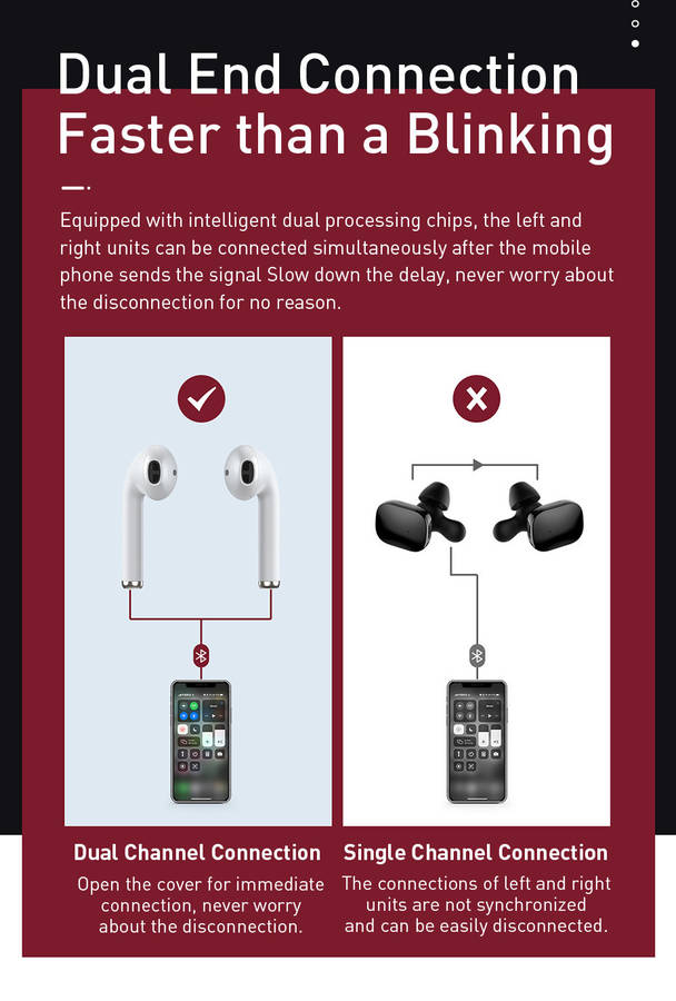 1. Featured with more efficient wireless 5.0 solution, enjoy quick connection when opening the cover, wider communication distance and lower delay.