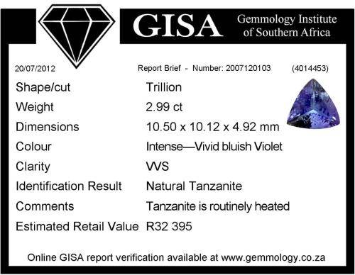 G I S A certified 2.99ct - Intense Vivid Bluish Violet - VVS Tanzanite - ( R32 395.00)