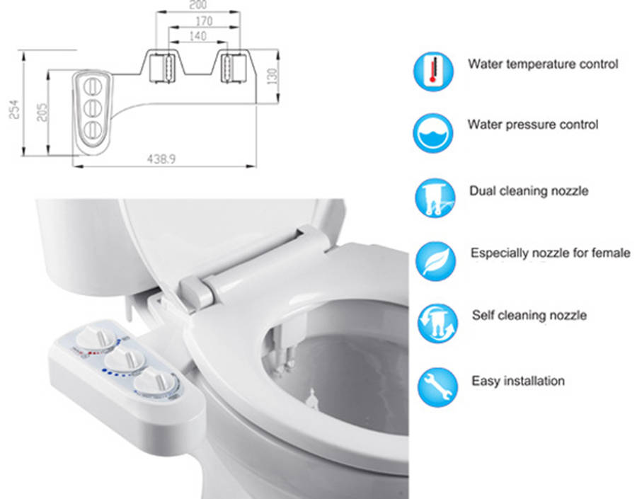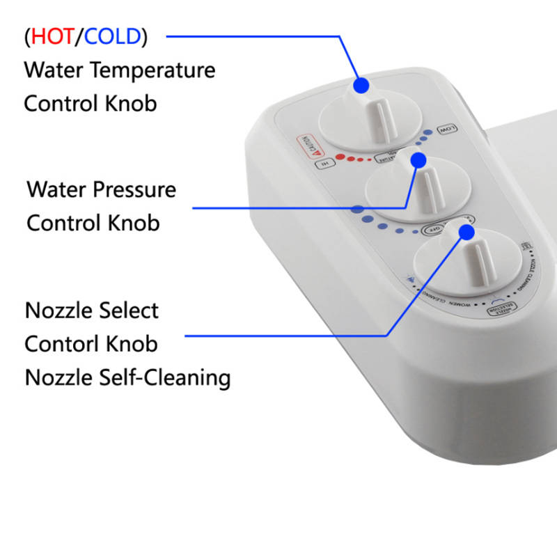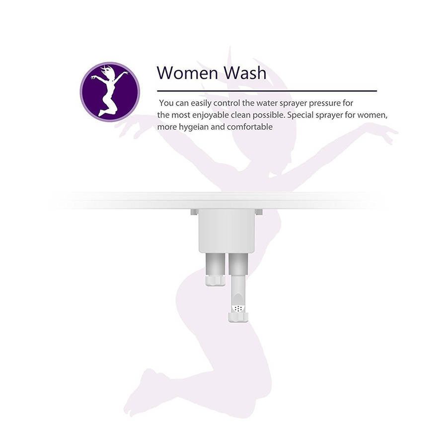Description: This intelligent toilet bidet seat sprayer is designed with multiple cleaning modes and adjust water pressure with the easy control chrome-plated knob, the traditional three-switch design is easy to use, ideal for seniors and kids.