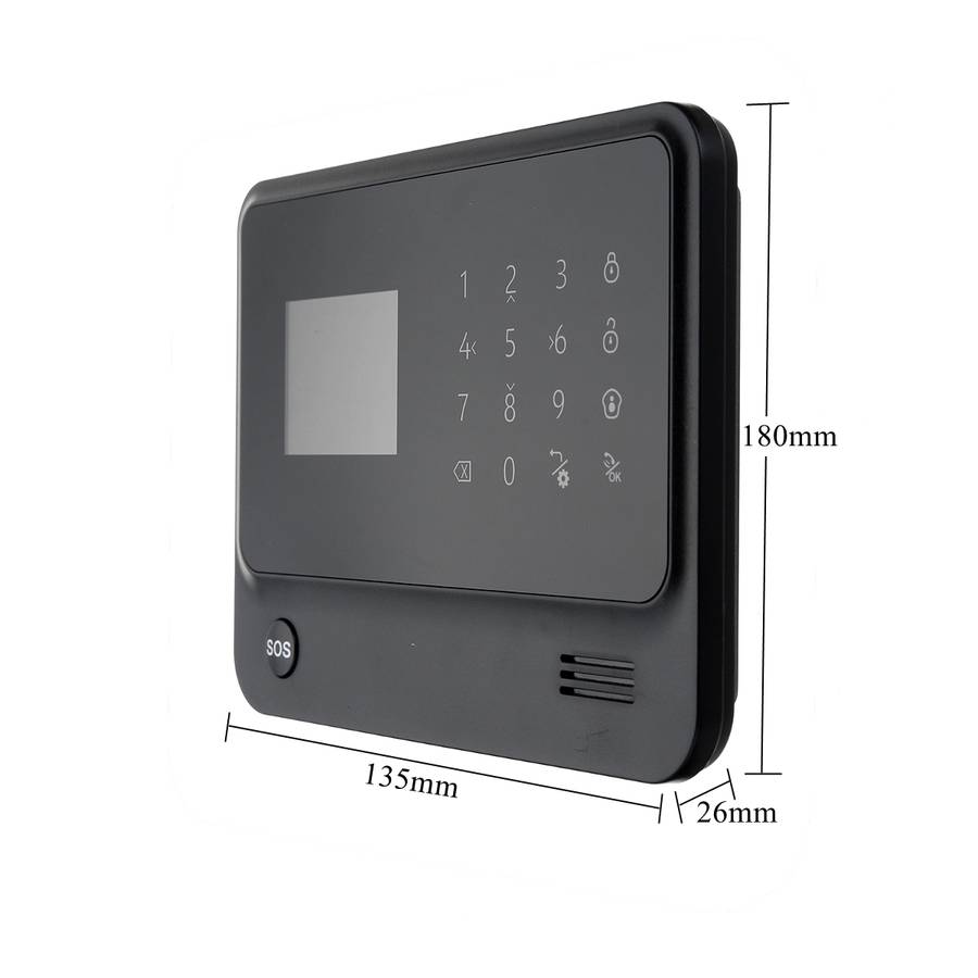 Zone names can be revised by user. Relay usages name can be revised by user 8 independent zones. Every zone can be set be independent zone, which can be only disarmed by APP and alarm host keypad. Leaving message remotely in APP. Information push promptly when AC power lost or recovered or detectors in low voltage. Smart zone function: self-checking windows/doors status when away arm host. 92 wireless zones, 4 wired defense zones, can store 6 alarm call phone number. Support ”ding dong” doorbell function. Arm/alarm delay for each defense zone. Time arm/disarm function. 10-second voice message recording. Arm/alarm Delay for each defense zone. Timed arm/disarm function. Built-in rechargeable battery. Supports monitoring and two-way intercom function. The host can be used as a hand-free phone.