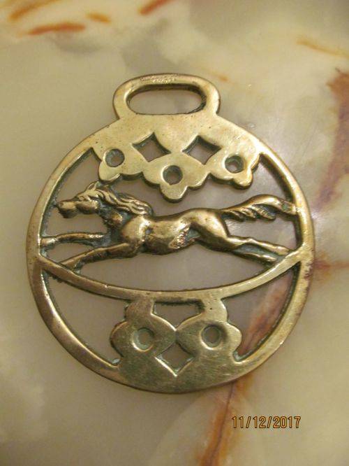 THIS BEAUTIFUL DECORATIVE HORSE BRASS MEDALLION DEPICTS A HORSE AT FULL GALLOP. THE ITEM IS ORNAMENTAL FOR THE MARTINGALE (LEATHER STRAP) ATTACHED TO THE HORSES HARNESS