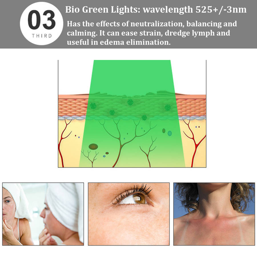Bio Green Lights: wavelength 525+/-3nm (16 LEDS): has the effects of neutralization, balancing and calming. It can ease strain,