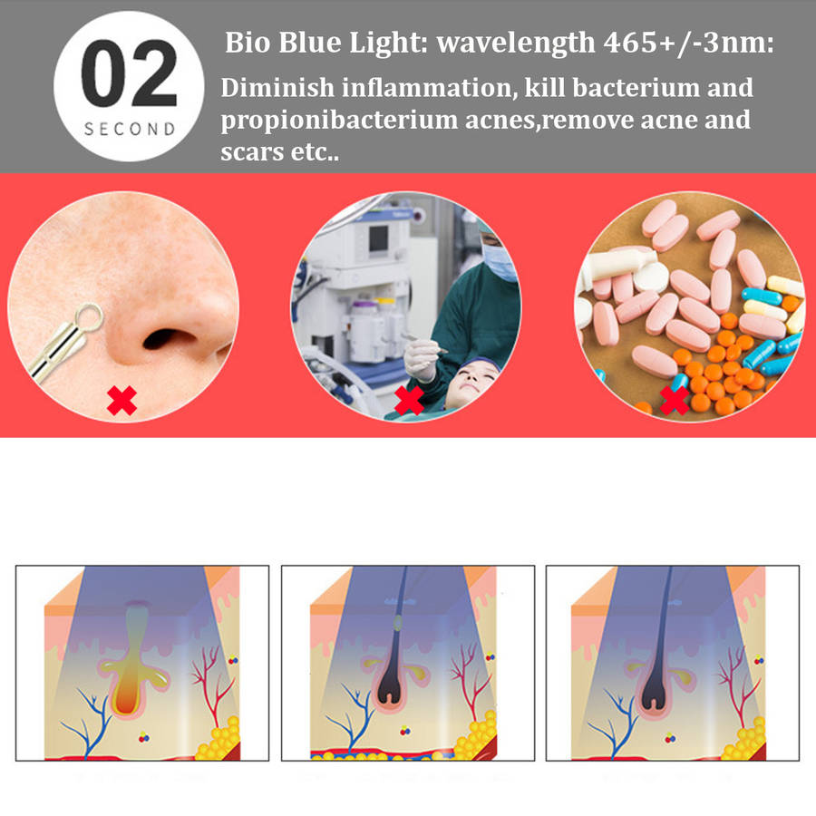 Bio Blue Light: wavelength 465+/-3nm (16 LEDS): diminish inflammation, kill bacterium and propionibacterium acnes ,