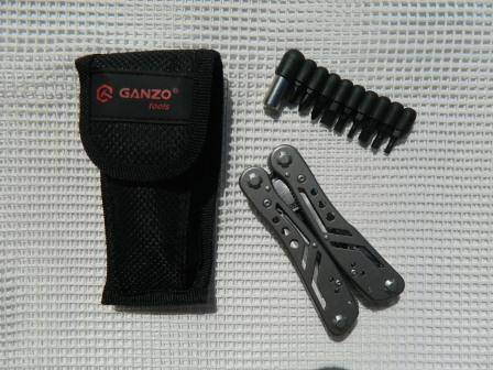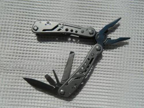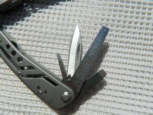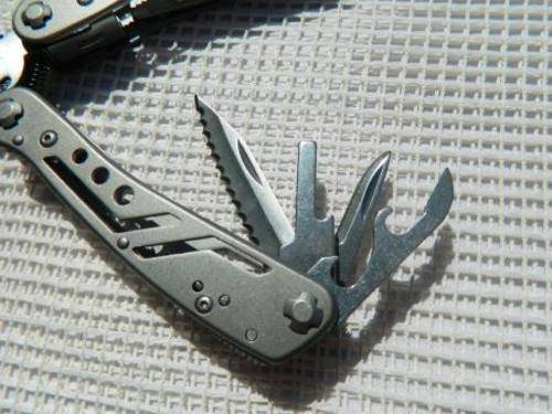 v Multi-Tool with Belt Pouch. Pliers, Wire Cutter, Large Flathead Screwdriver, Small flathead screwdriver, cross point screwdriver, Fine Edge Knife Blade, Serrated Knife Blade, Bottle Opener, Can opener, Ruler, File, AWL