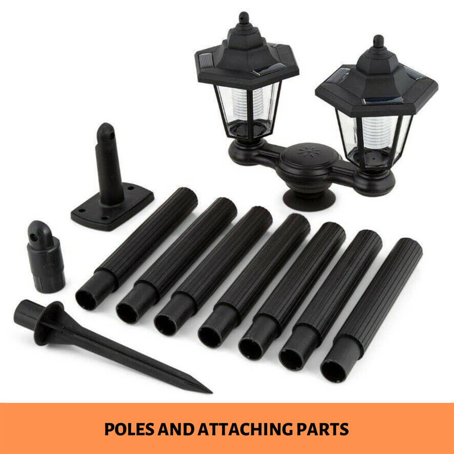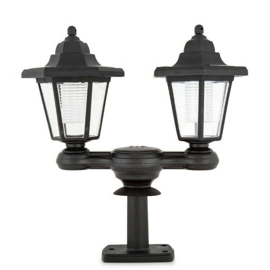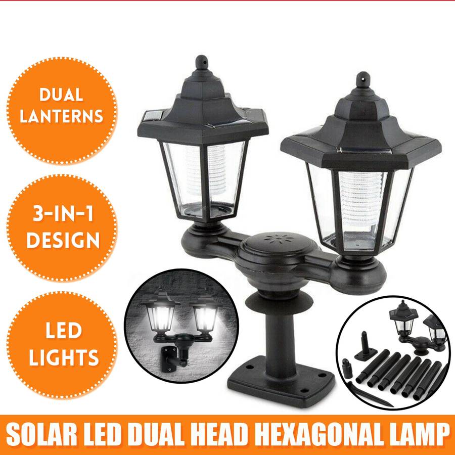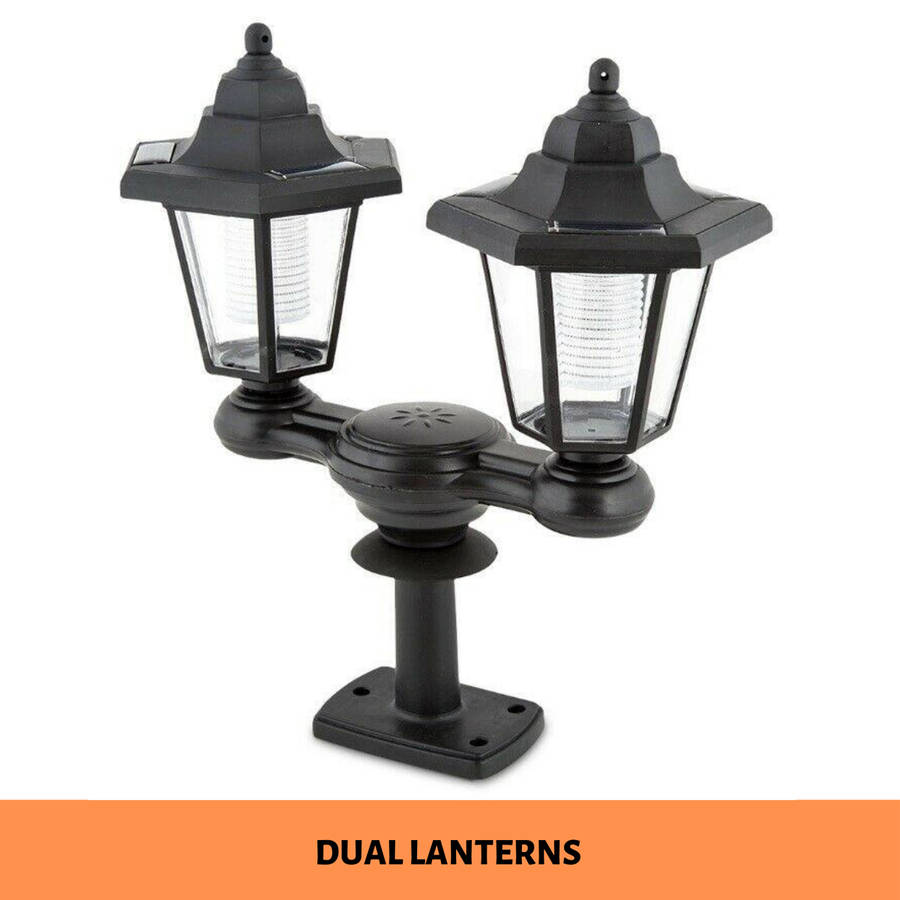- Mount these dual lanterns on a wall, stake them in your garden, or install on their included lamp pole! These solar-powered LEDs automatically light up at night and turn off to charge throughout the day. Requires no battery changing or expensive wiring, and will add a unique and decorative feature to your outdoor area.