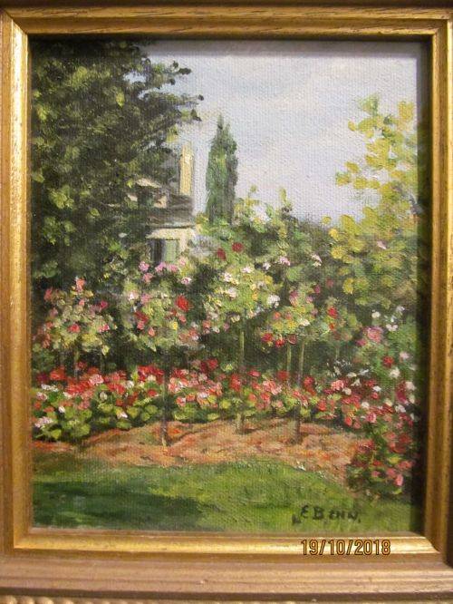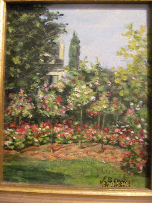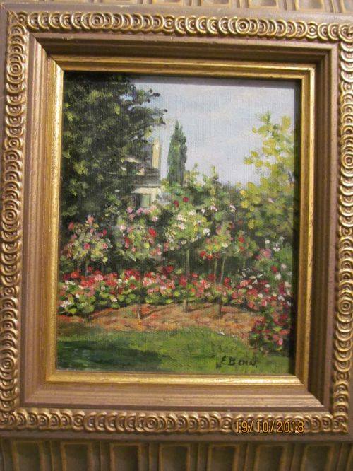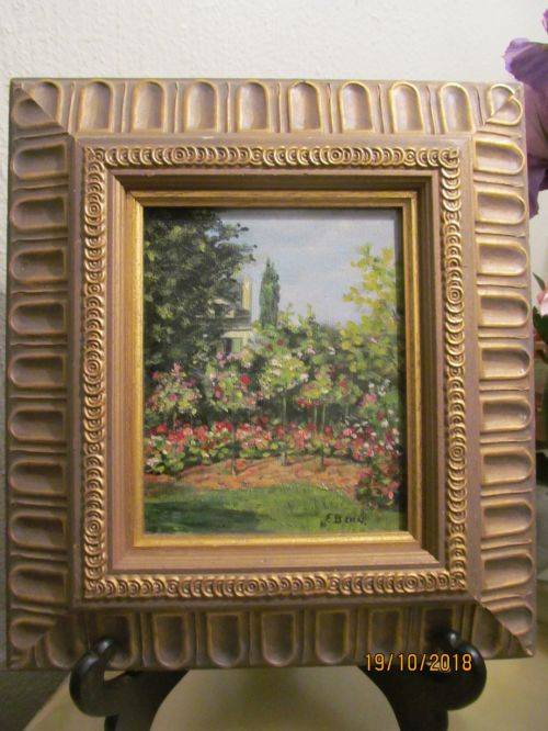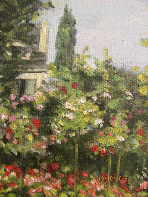 FRAMED IN A VINTAGE WOOD FRAME PAINTED IN A GORGEOUS MUTED GOLD COLOR AND DECORATED IN ATTRACTIVELY CARVED PATTERNS ALL IN RAISED DETAIL, THIS FASCINATING WORK OF ART IS A VIVIDLY BRIGHT AND CHEERFULLY COLORFUL OIL ON CANVAS WHICH DEPICTS AN IDYLLIC GARDEN OF ALLURING FLOWERS BLOOMING GRANDLY IN THEIR GREEN SURROUNDINGS WHILE A LARGE HOME IS PARTLY VISIBLE THROUGH THE TREES AND A SUPERIOR BLUE SKY LITERALLY GLOWS FROM ABOVE