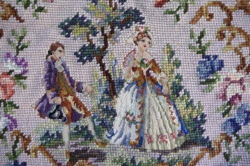 This beautifully hand stitched tapestry is of a couple under a tree in a garden. The stitching of the couple is Petite Point in Embroidery Silk, the surrounding scene is stitched in wool. Size is 410 mm x 410 mm, overall size is 640 mm x 860 mm.