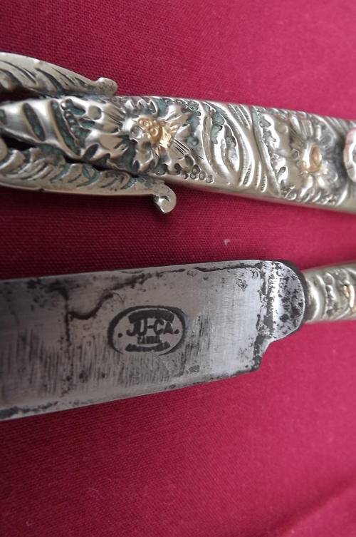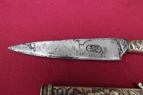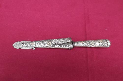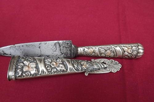 Gaucho knife from Tandil Juca Argentinia 1943.Handle and sheath .800 fine silver.Decorations in gold foil overlay.Blade still in good condition.See scan