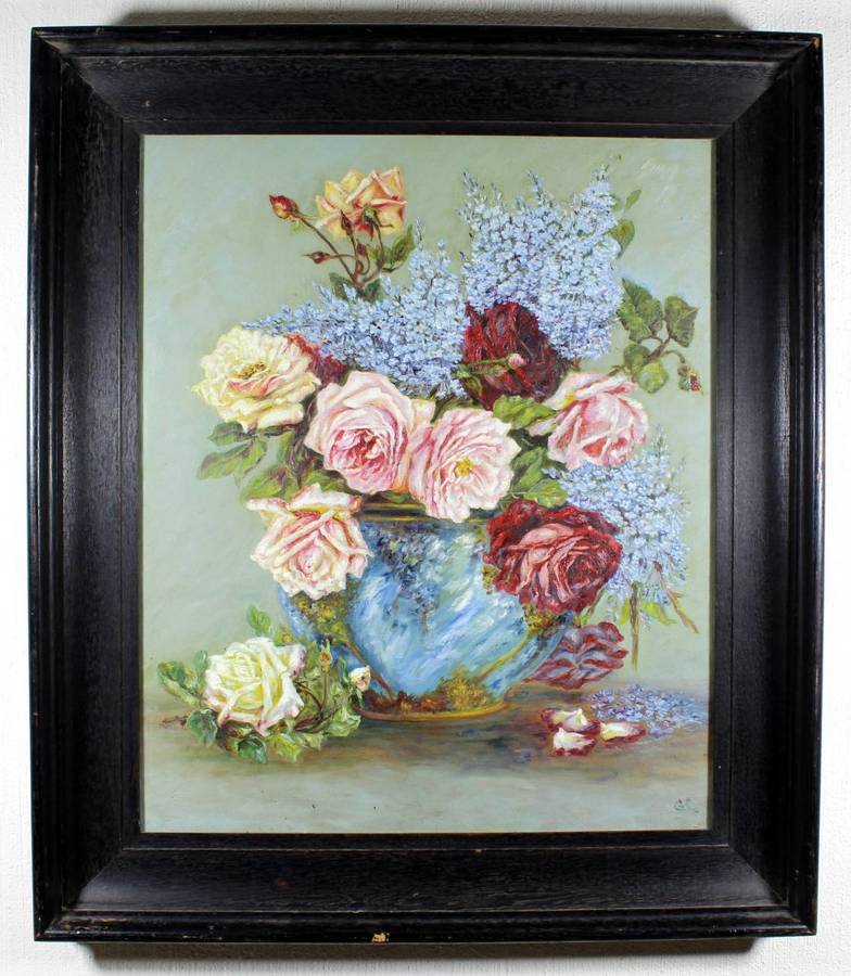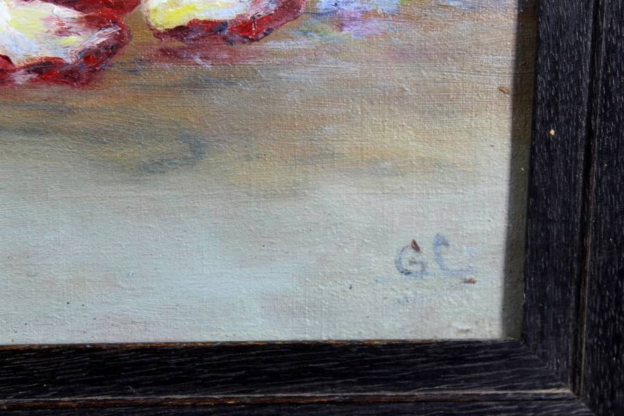 A beautiful oil painting by a very talented artist! The level of detail on this oil on canvas still life is outstanding. The painting probably dates from the first half of the previous century and is in its original dark heavy frame under glass. It is signed with the initials GC. This beauty measures 60cm x 49cm and the frame measures 76cm x 66cm. Bid now!