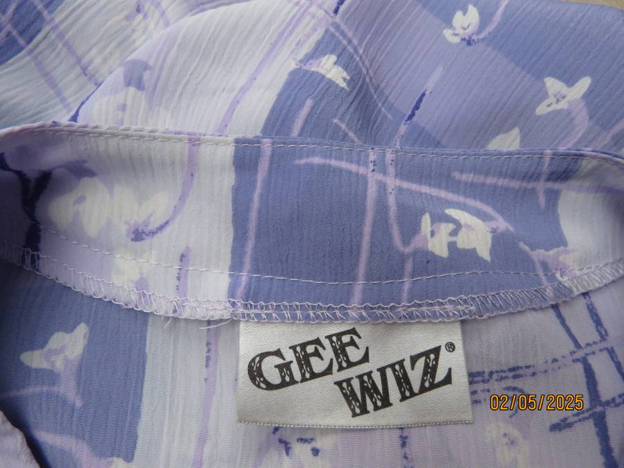 GEE WIZ collarless V neck button down top in colour block shades of lilac with tiny white flowers. Size 42-18. Short sleeves. Slits at sides. As new condition.
