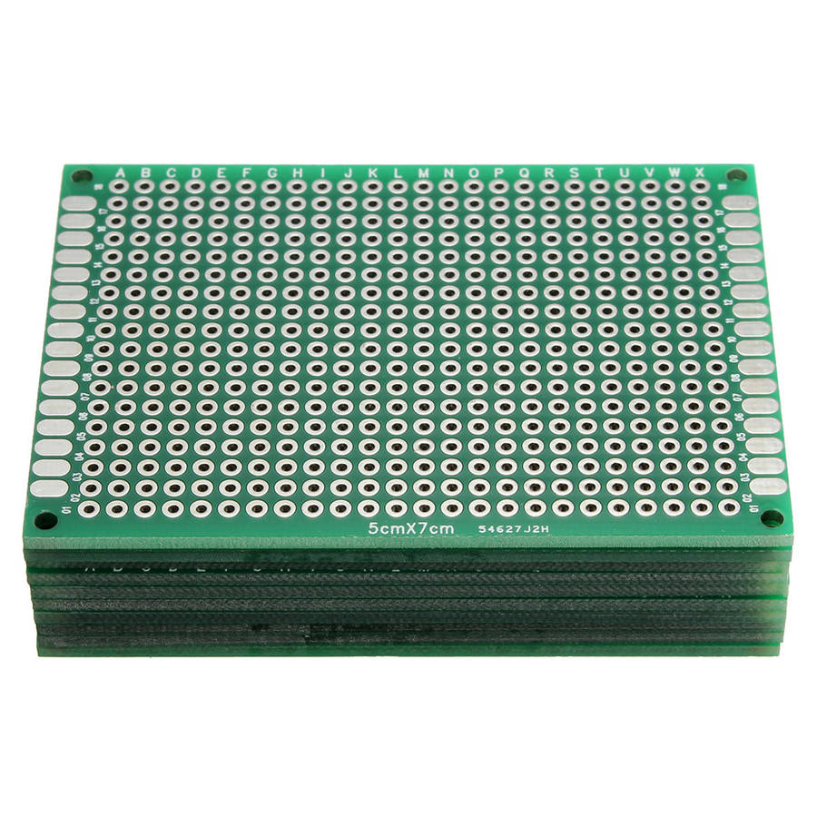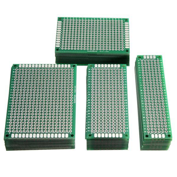 Total 40pcs, each size 10pcs Grid : 0.1 (2.54mm) Thickness : 1.6mm(5pcs) Hole diameter : about 1mm The diameter of 4 large positioning holes: 4mm Material : FR-4 (glass fiber) All holes are plated through Both sides are identical Dimension Hole(column x row) Quantity 50 x 70mm, 1.97 x 2.76 24 x 18 10 40 x 60mm, 1.57 x 2.36 20 x 14 10 30 x 70mm, 1.18 x 2.76 24 x 10 10 20 x 80mm, 0.79 x 3.15 28 x 6 10 Package included: 40 xFR-4 double side prototype PCB printed circuit board