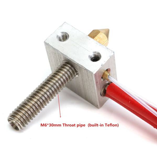 Package weight: 0.04 kg Specifications: Material: Aluminum & Stainless Steel & Brass Installation type: External thread connection Scope of application: 3D printer Nozzle size: 0.4mm Throat pipe length: 30mm Aluminum block size: 20 mm x 20 mm x 10 mm Operating temperature range: -40°C to +260°C (-40°F to +500 °F) Thermistor and heater cable length: 1M Features: Tip of the nozzle, aluminum heating block, Throat pipe (built-in Teflon). MK8 Extruder Hot End kit, white wire was temperature thermistor, red wire was heating tube 12V40W. Package included: 1 x Aluminum block 1 x Heating tube (heating tube 1 m long, 12V 40W) 1 x 1.75MM 0.4MM Brass Nozzle 1 x M6*30mm Throat pipe (built-in Teflon) 1 x Thermistor + Brass sleeve (1 meter long)