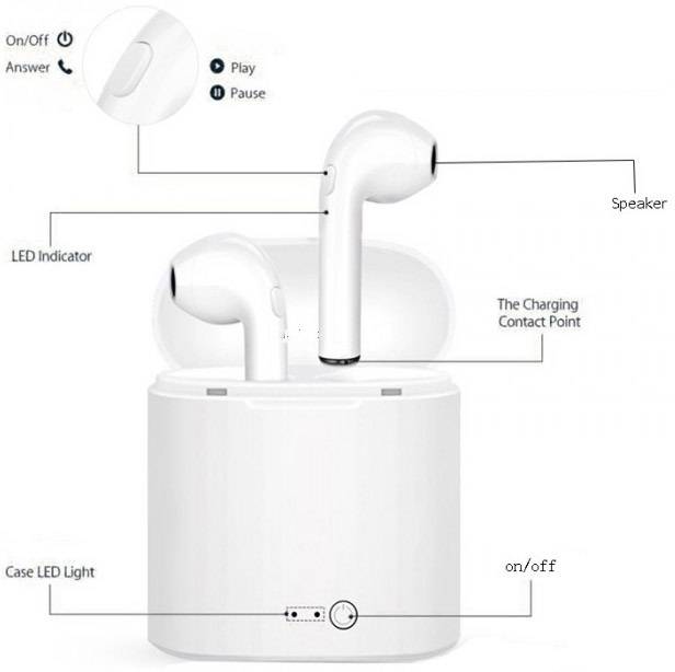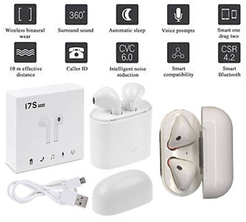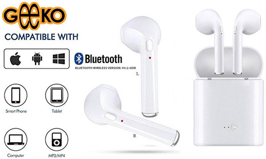 Geeko Siamese True Bluetooth Wireless EarBuds with Charging Dock and Microphone -Bluetooth V4.2+EDR , Up to 10 metres Transmission distance, Built-in 60mAh Rechargeable lithium Polymer battery per EarBud , Talk time: Up to 2 hours, Music Playing time up to 3 Hours , Changing Time: 1-2 Hours, Standby time: 40 hours, 900mAh Power Bank Charging Dock, Compatible with all Bluetooth-enabled devices, such as iPhone, iPad, Samsung, LG, Nokia, HTC, Tablets-Colour White, Retail Box , 1 year Limited Warranty.