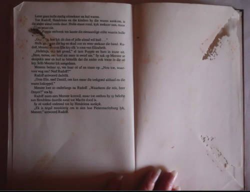 GEEN STOFJAS, EERSTE BLADSY VERWYDER, SKADE AAN LAASTE TWEE BLADSY (BEINVLOED TEKS)
