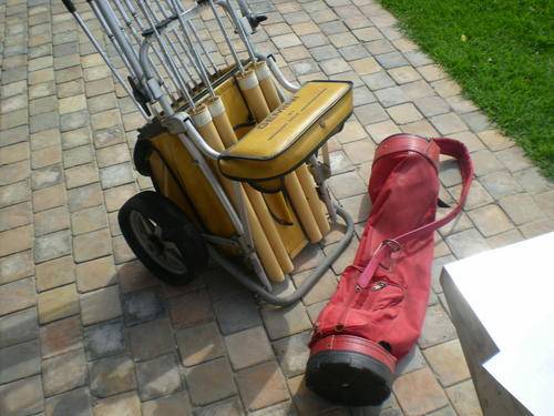 Gemini Golf Trolly with Seat, set of Irons EEE3ZZZ, mixed woods No 5,4,3, & No 1. Red Golf Bag & 15 Golf Balls included. Pocket at back has latch missing.