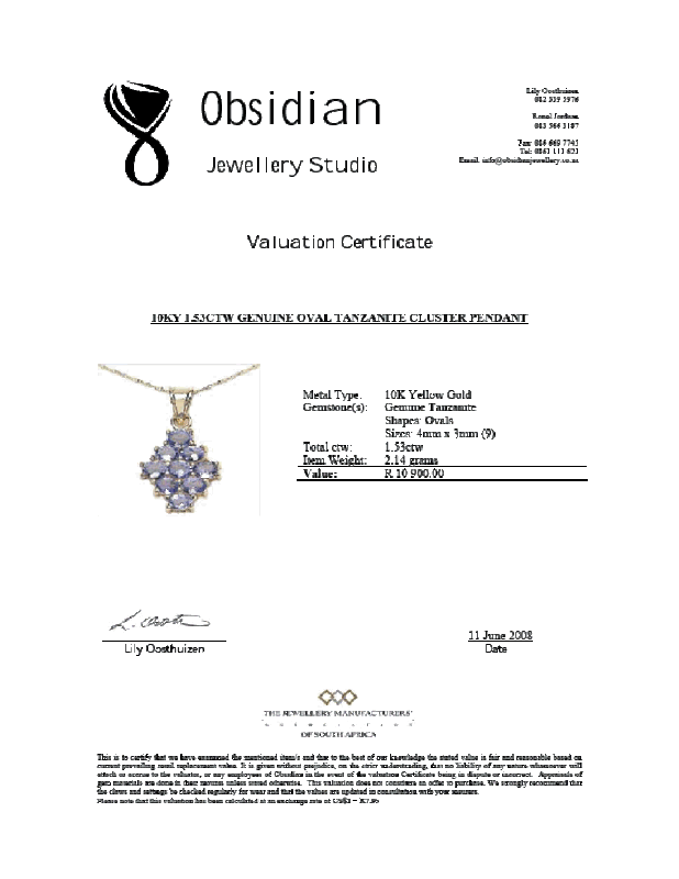About our Diamonds, Jewellery and Gems: It is important to ensure that you buy the best possible diamond for your money. We believe in offering you true, accurate grading- as buying the wrong grade diamond in terms of color and clarity could be costly.Working with us, we have numerous suppliers and individuals making sure that you get what you pay for. All our diamonds are either EGL certified, or graded by a qualified EGL Diamond Grader (this person is not in our employ, but independent). We have 2 fully qualified EGL graders to our disposal.All Valuations on Jewellery is done by Obsidian Jewellery Studio, member of the Jewellery Manufacturers' Association of Sout Africa and contracted by Outsurance as a preferred merchant.