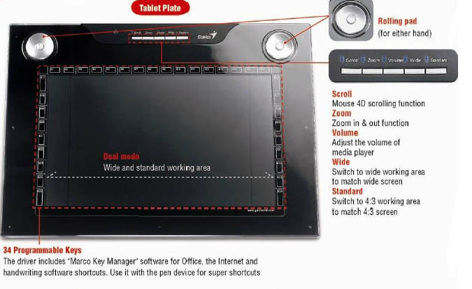 The two rolling pads at the top of the tablet are convenient for either hand. As you press the hot keys (Scroll, Zoom, Volume), the blue LED will blink and you can use the rolling pad to easily operate the 4D scrolling, zoom in /out and volume up/down functions. The sleek elegant-black design with dual mode active area is a perfect fit for wide and standard screens. There are thirty four fast shortcut keys you can select with the pen for instant access to Office, Internet and Vista functions. The cordless pen features two buttons and 1024 level pressure sensitivity for drawing or writing. While you draw or write with the digital pen, you can control the shapes and thickness easily.
