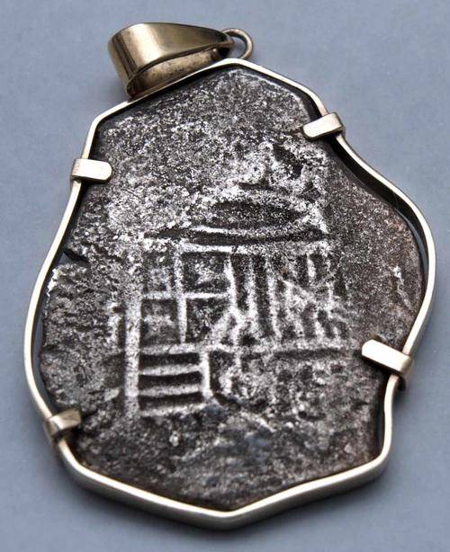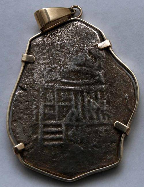 A genuine 17th Century 8-Reales cob coin marked with the Spanish coat of arms of Filipe IV, minted in Mexico City in around 1650. It appears to be a shipwreck coin, and it is mounted as a pendant in a thick, loose band of 9ct gold (stamped 325), which can easily be removed, leaving the coin in its original state.